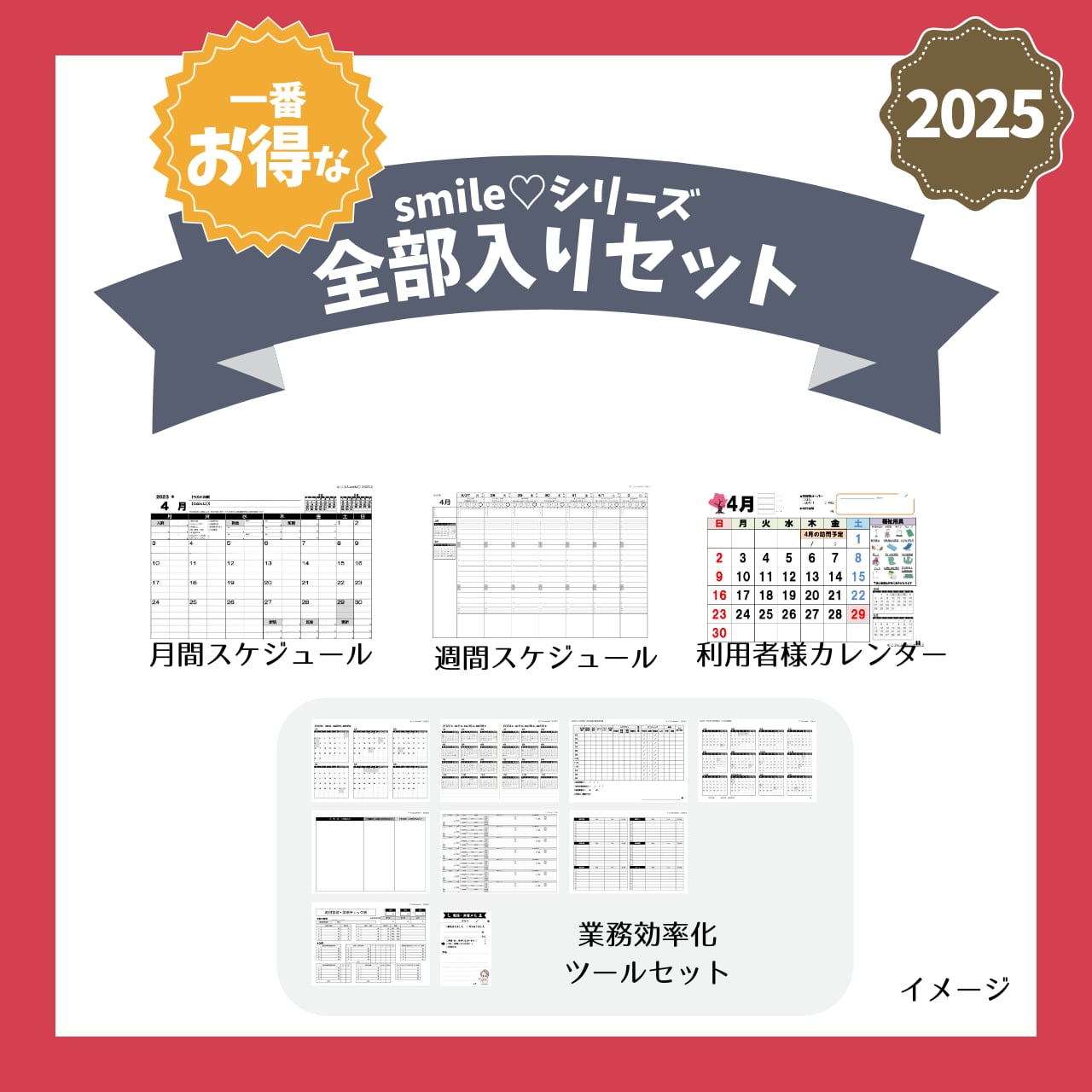 ケアマネ手帳2026(全部入りセット)ダウンロード版は、ケアマネジャーの方々がスケジュール管理・業務管理を行うために専用に設計されたツール(smile♡シリーズ)の全ての帳票が一度に手元にダウンロードできるお得な商品です。